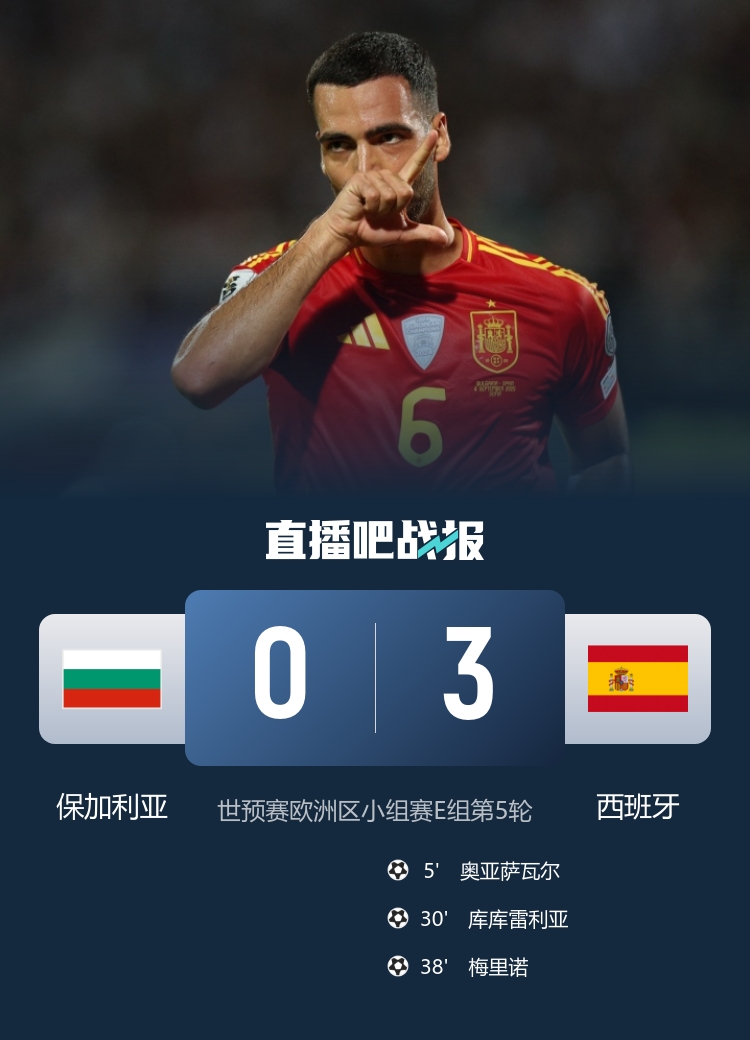 世预赛欧洲区小组赛E组第5轮,西班牙3-0保加利亚,上半场,奥亚萨瓦尔、库库雷利亚、梅里诺先后建功。