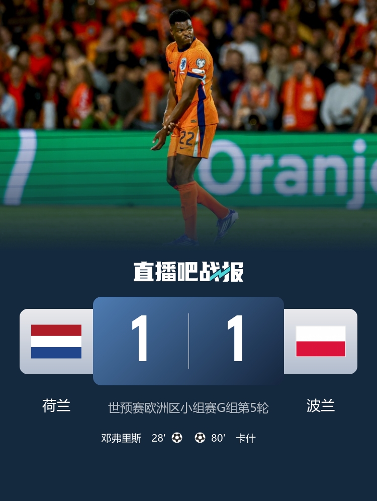 世预赛欧洲区小组赛G组第5轮,邓弗里斯头球破门,卡什80分钟扳平比分,荷兰主场1-1战平波兰。